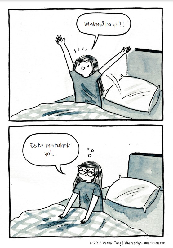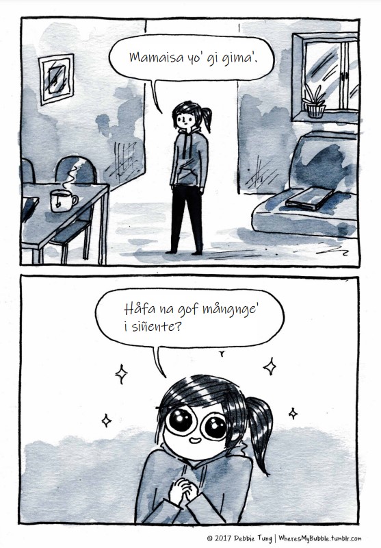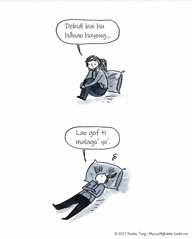 Kao guaha na un li’e’ i che’cho-ña si Debbie Tung? Ti hu tungo’ este na attista asta ki hu fåhan i lepblo-ña, “Guinaiyan Lepblo.” Gof kiñute i pinentå-ña siha! Malago’ yo’ pumula i che’cho’-ña sa’ siempre para u ayuda yo’ tumungo’ i lengguahen Chamoru. Mamula yo’ tres comics guini na post. Taitai yan gosa!