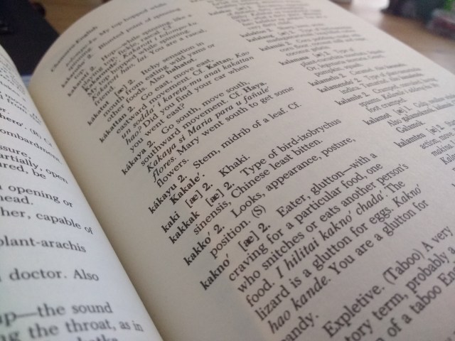 The first thing to do is make sure you have all available Chamorro dictionaries so you can check across all of them. This is critical, because some dictionaries have words that are missing from the others. And older dictionaries tend to include definitions that aren’t in the modern dictionaries.
