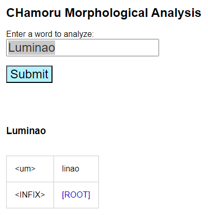 To illustrate how this works, let’s look up the word luminao. Look for the entry that has [ROOT] underneath it, because this is the tool’s guess at what the root word could be. For luminao it tells us that the root word is linao: