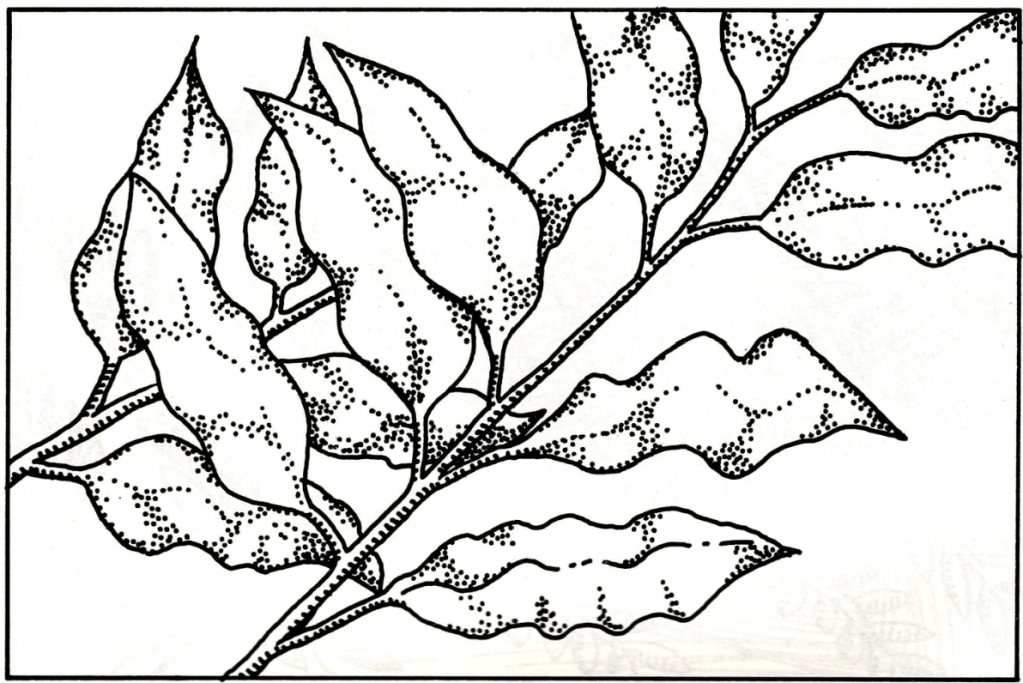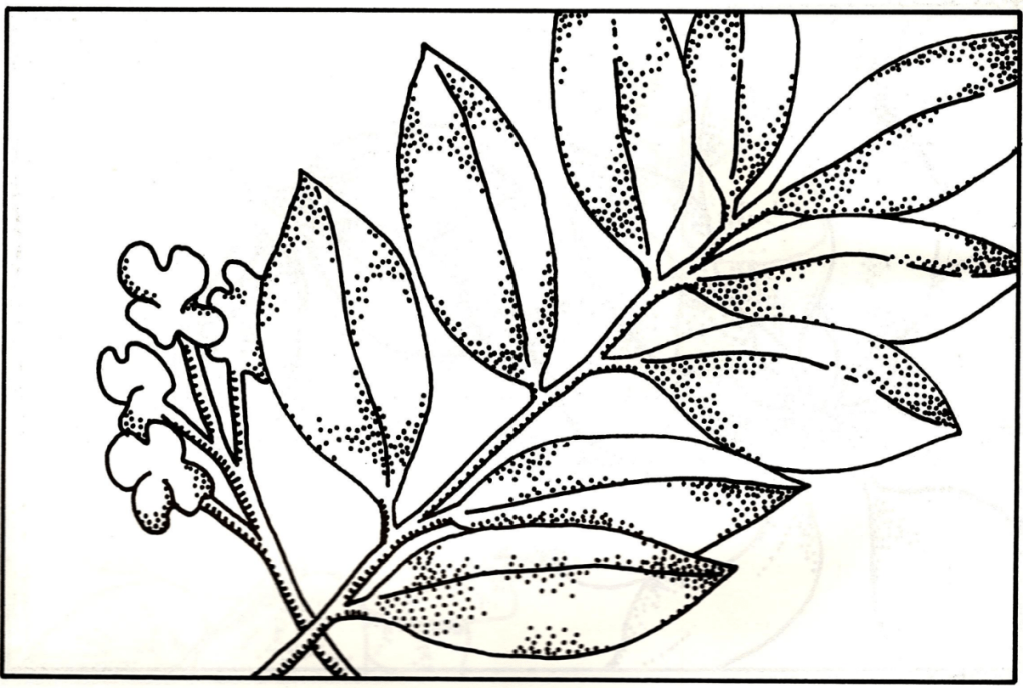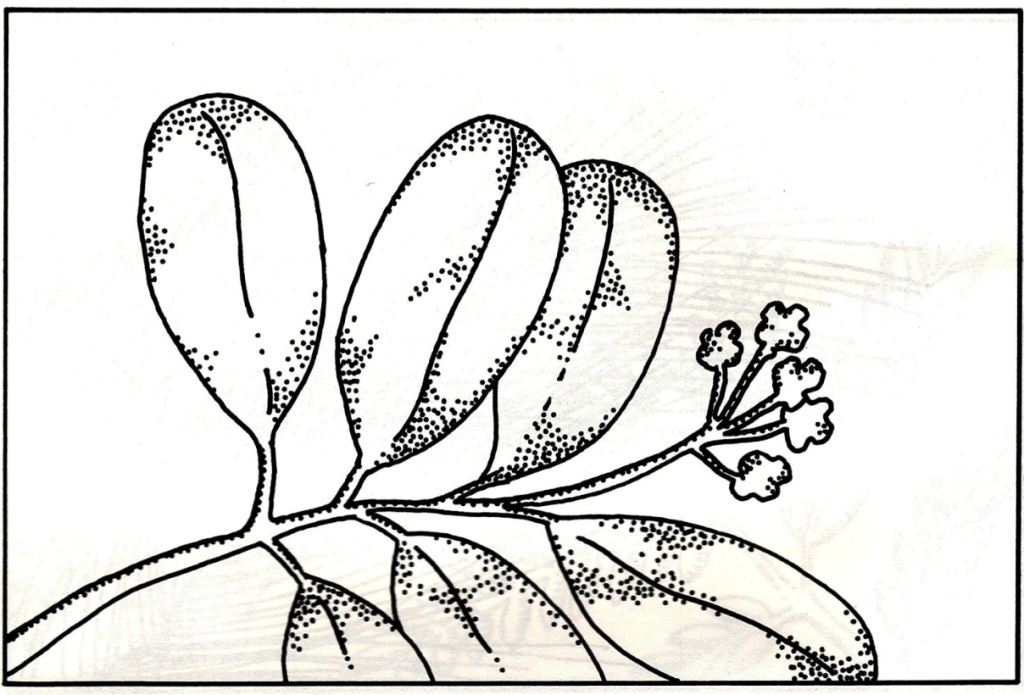 “Palo Maria” means Maria’s cane. This name is Spanish. This name of this tree is the “Da’ok.” Its leaves are oval and blunted, and they’re also very stiff and thick, and the rib of the leaf is very visible in the middle. Its fruit is green and round, and they hang down from its branches. Its flowers are white and very fragrant.