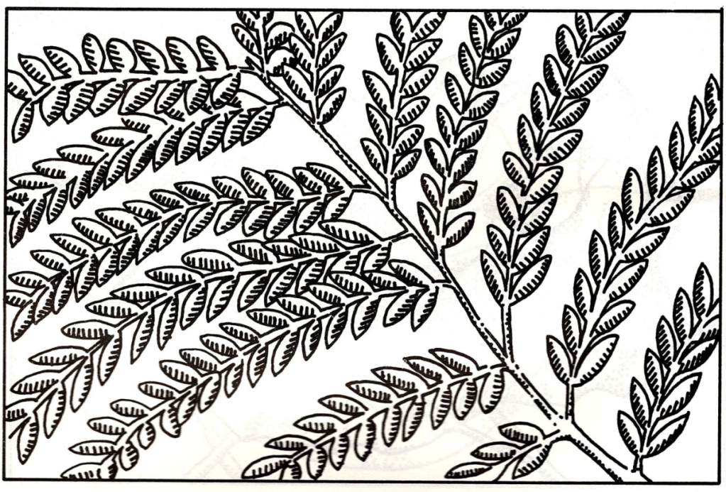 This tree is one of the most beautiful flowering trees on Guam. This plant was brought from India. It’s not a very big tree, this one. The leaves double-up and are pointed. Its pods are rounded and very brown when ripe. Sometimes they are sixteen inches long.